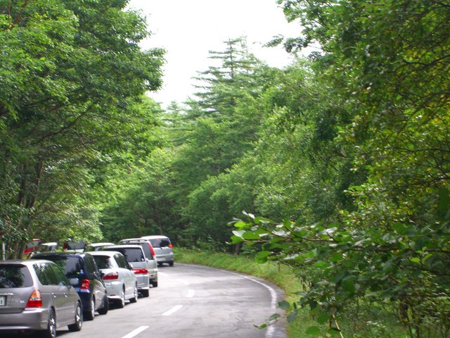 五合目手前の道路の片側には多くの駐車列が続く、やっとスペースを見つけて駐車出来た。