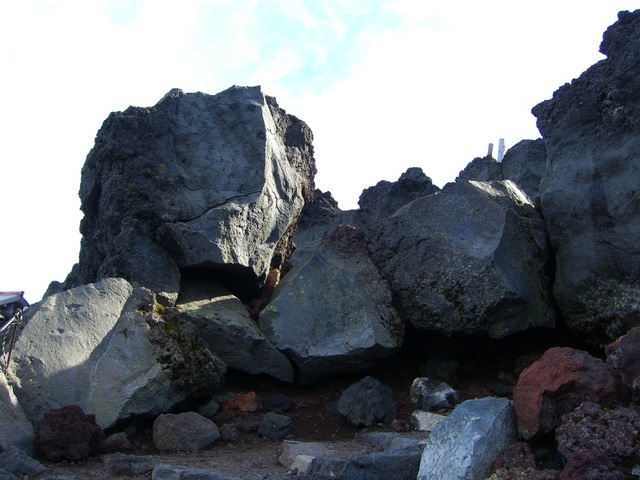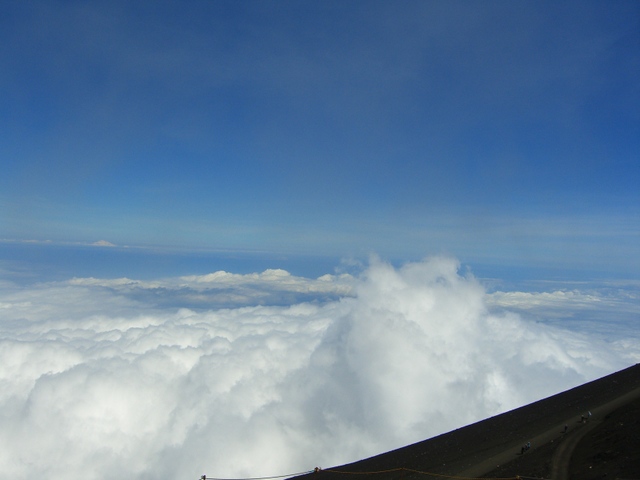 此れが、あの有名な富士山の山頂だ! 下界は雲に覆われていても、そこは晴れ渡った世界、私でも雲上の人(文字通りで)になれた