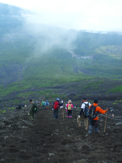 霧がかかっていて富士山の上部は拝めない。 黙々と前を行く登山客について行く。